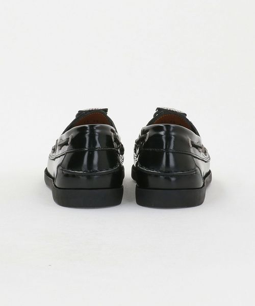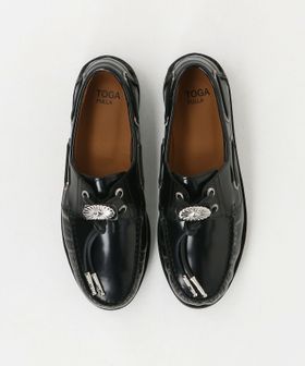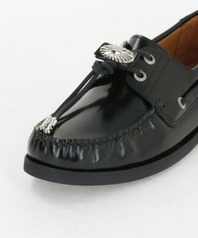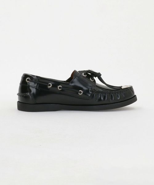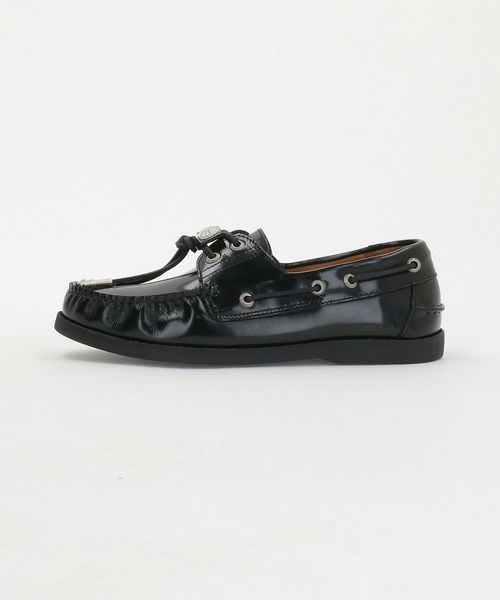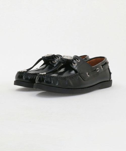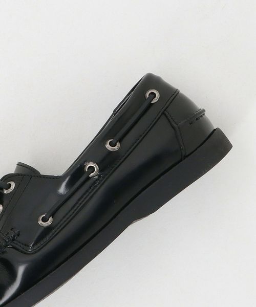メタルパーツをあしらったシューレースが特徴のデッキシューズ。