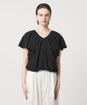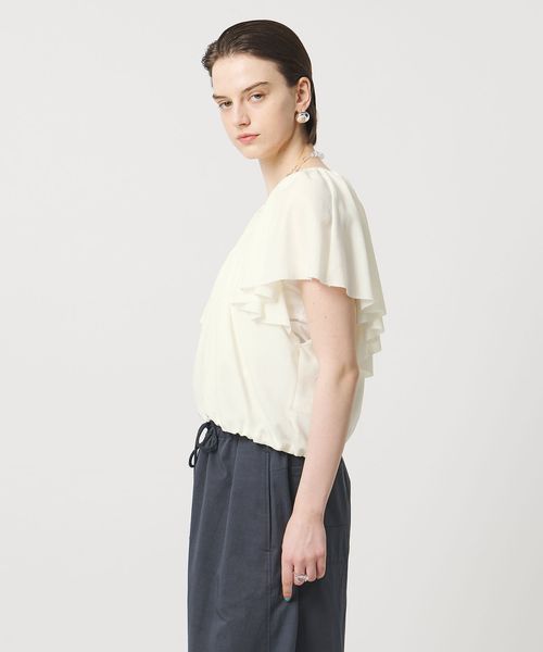 フリルデザインがフェミニンな印象のVネックブラウス。