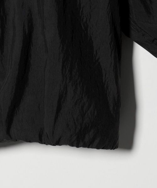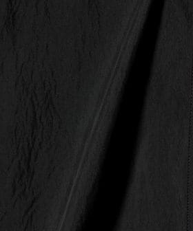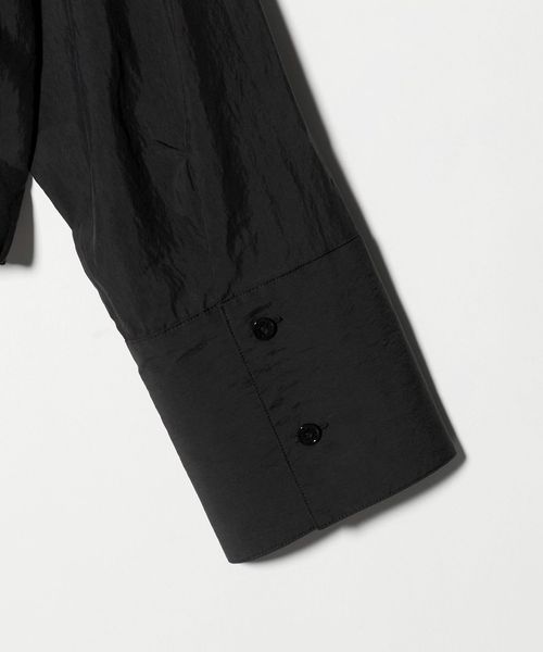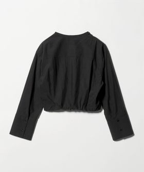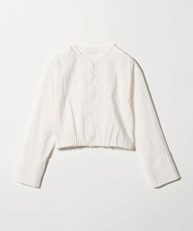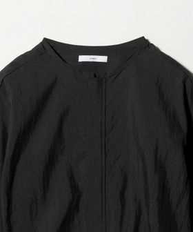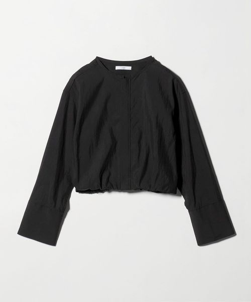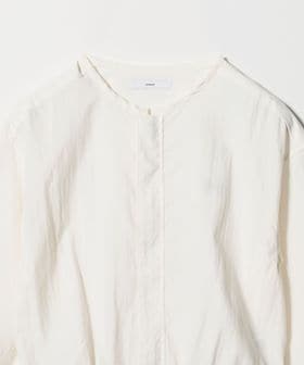ワイドカフスと短めの着丈バランスが特徴のノーカラージップブラウス。
