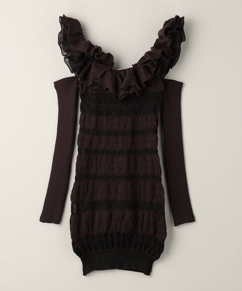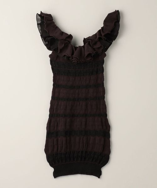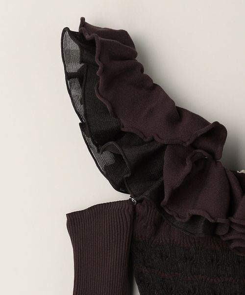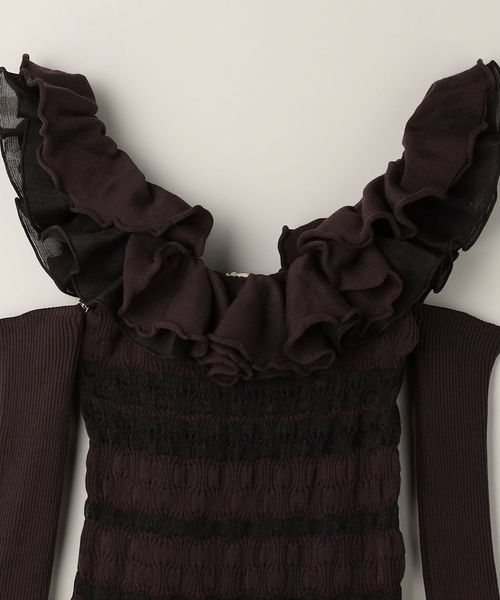 今季注目カラーを取り入れた、フリルのネックラインが印象的なニットドレス。
