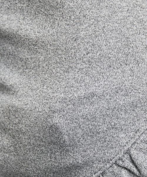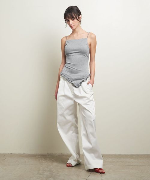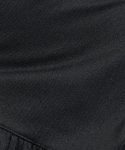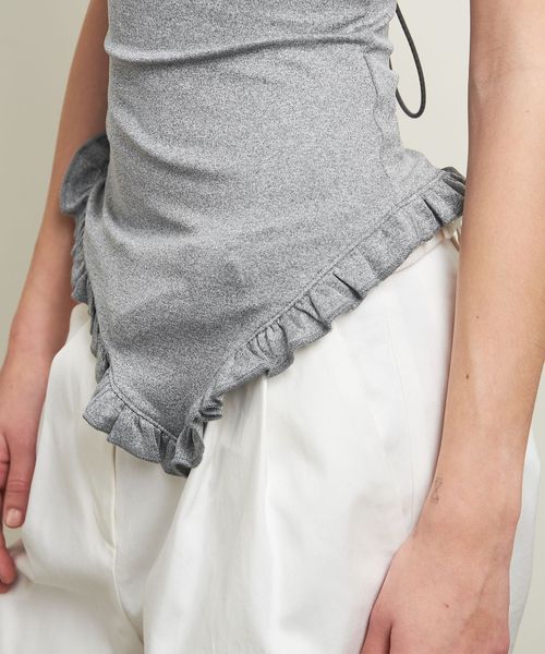 アシンメトリーカットの裾はミニフリルでトリムされ、スポーティーな素材とのコントラストがポイント。