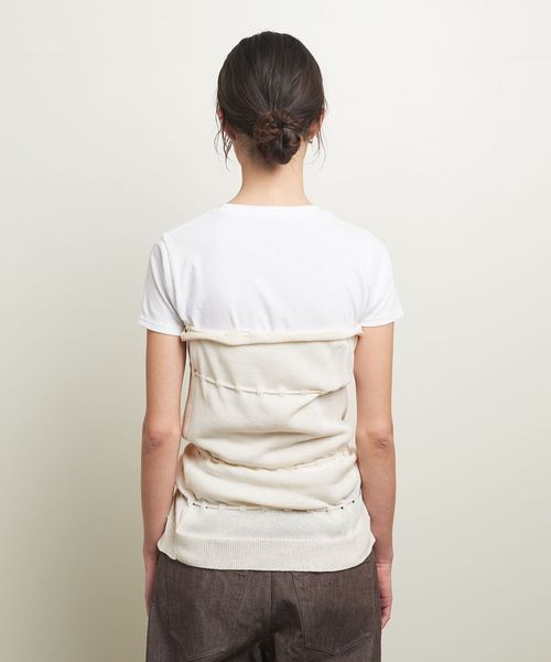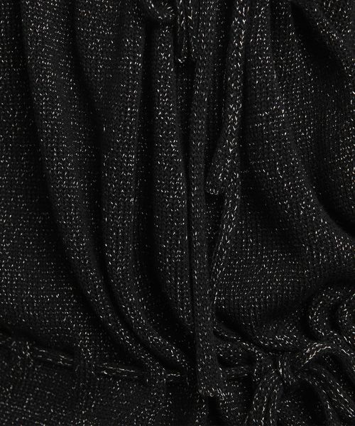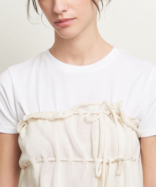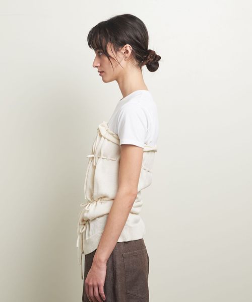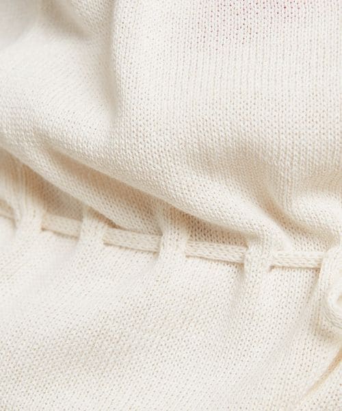 本体に通ったストリングでギャザーを寄せて着用するニットトップス。