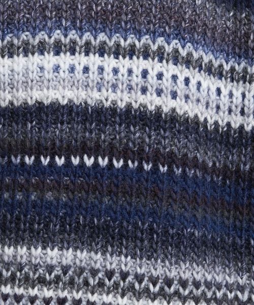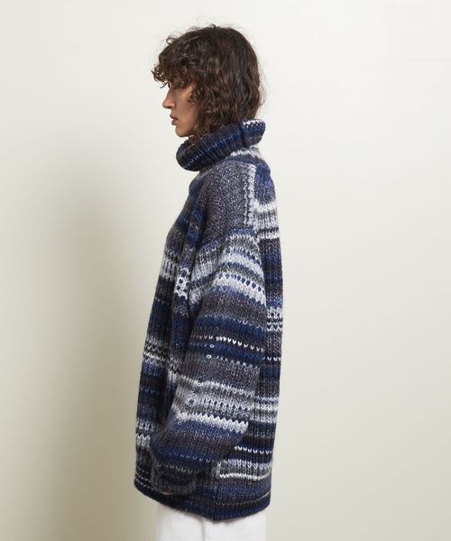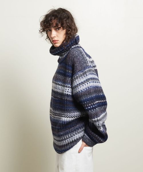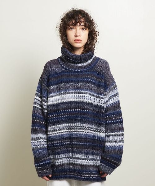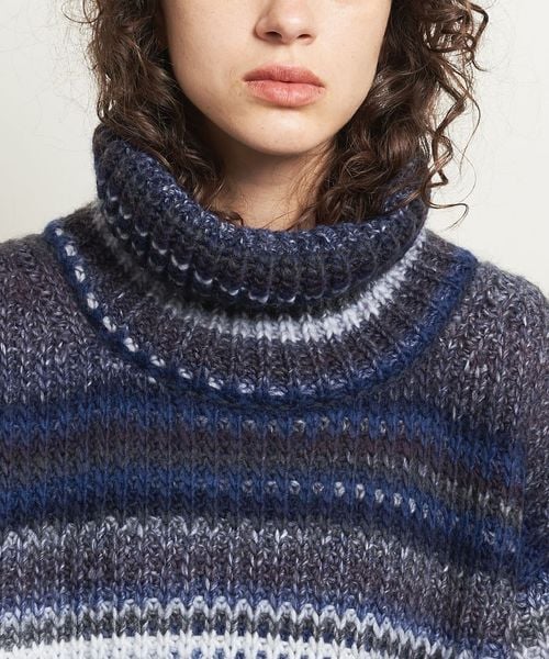 絣ボーダー柄がノスタルジックな雰囲気のタートルネックニット。