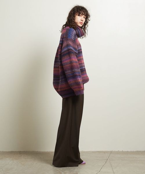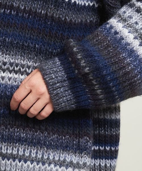 軽い糸を複数カラーでスペースダイして仕上げ、ざっくりとボリューミーなサイズバランスになるようにこだわった一着。