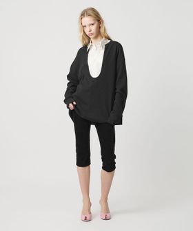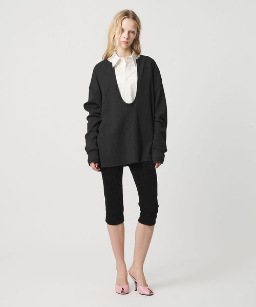胸元の深いVネックのようなデザインが魅力的で、インナーとのレイヤードを楽しめる一着です。