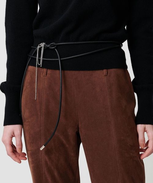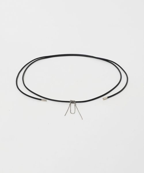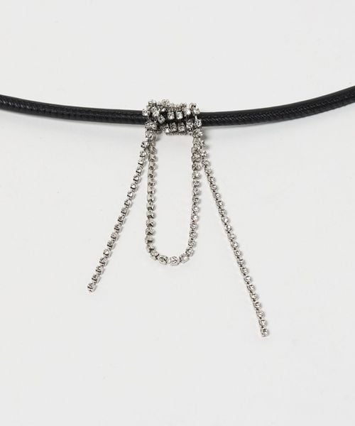 コードのような華奢なデザインに、無造作にあしらったラインストーンのチェーンが華やかなレザーベルト。