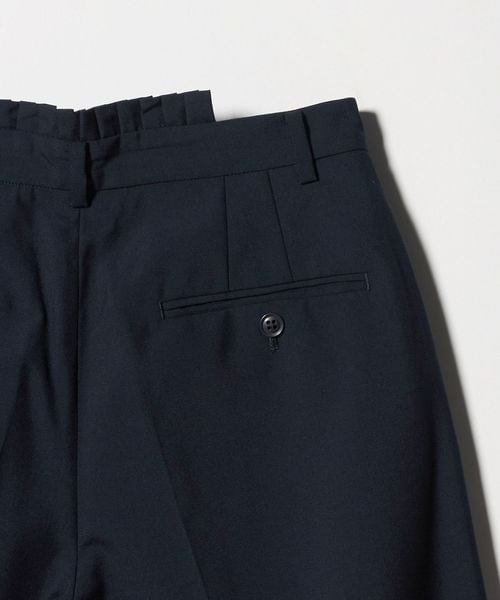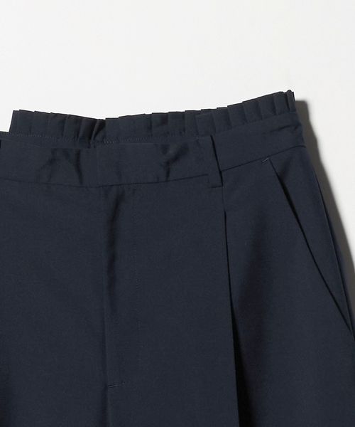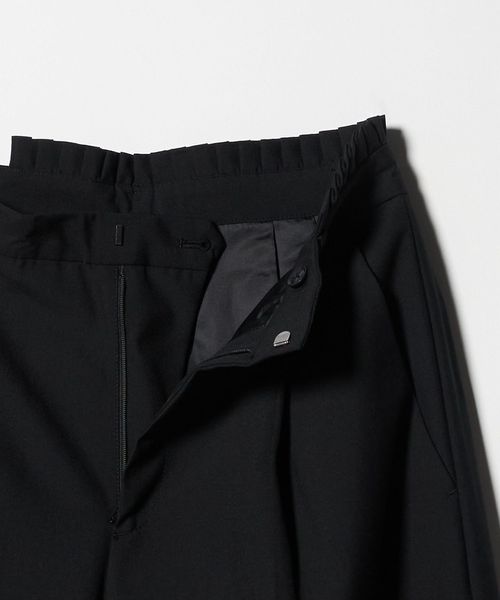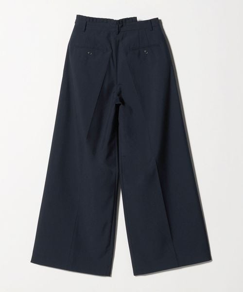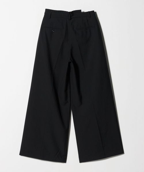 片側のサイド部分から後ろにかけて同素材のプリーツパーツを施したデザインが印象的なワイドスラックス。