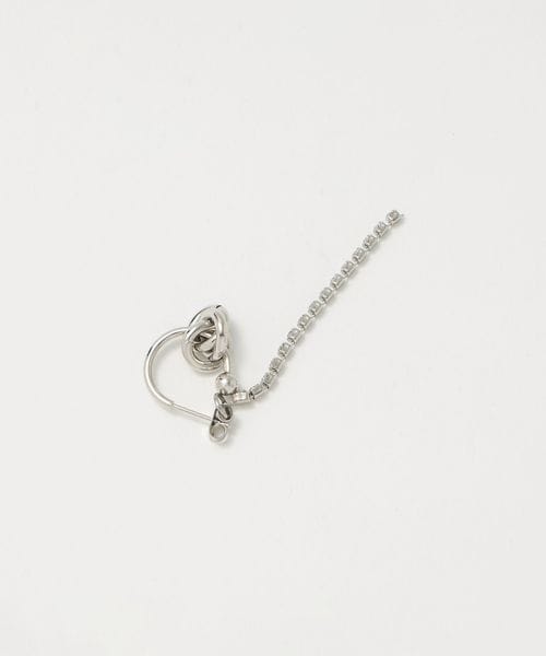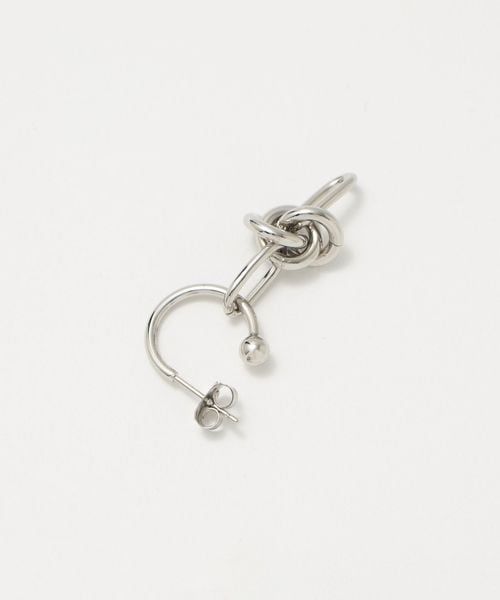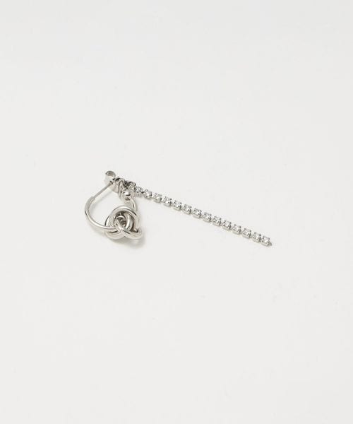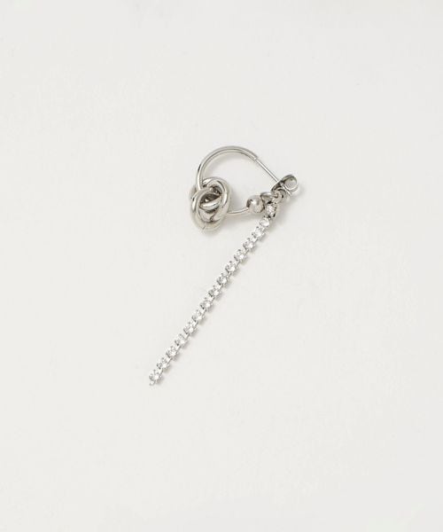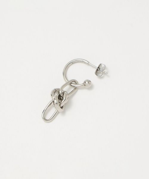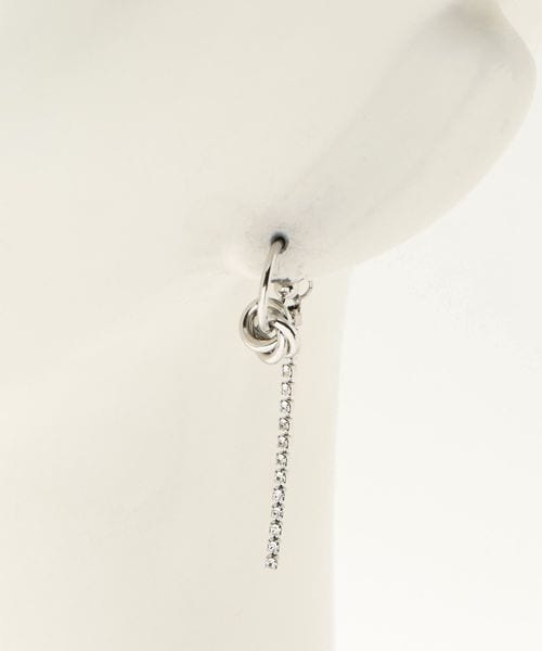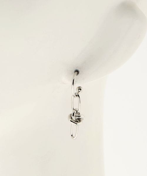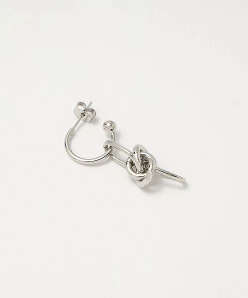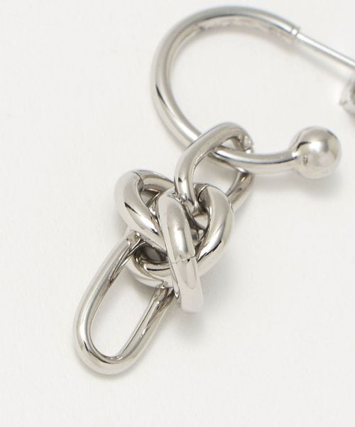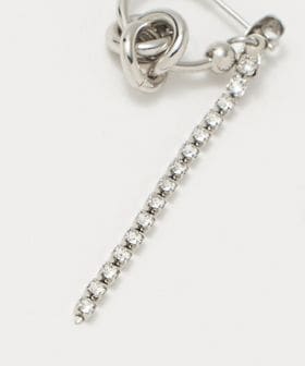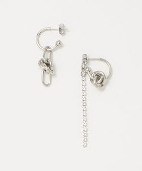 片方のフープにはノットを施しそこからクリスタルチェーンが垂れ下がる華やかなデザインで、もう片方のフープにはノットで繋がれた2つのリンクがある個性的な一品です。