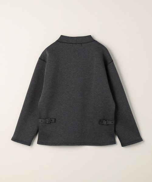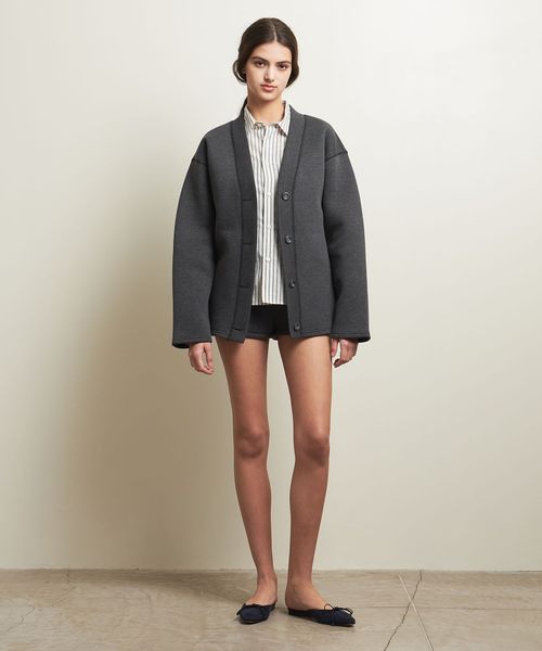 ニットカーディガンのようなVネック×ボタン開きのデザインを、やや張りのあるボンディング素材でお作りしトレンド感溢れる一着に仕上げました。