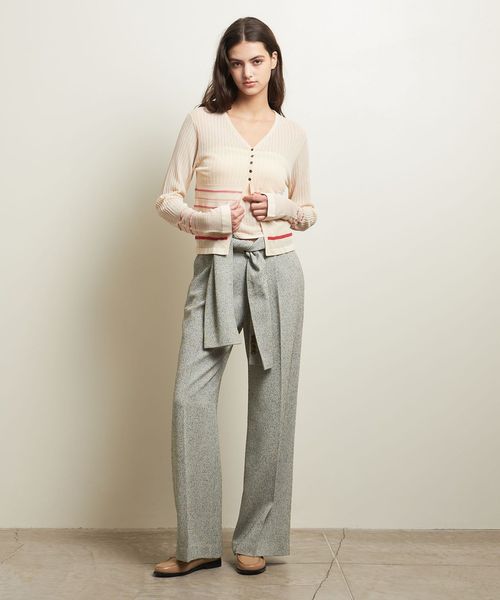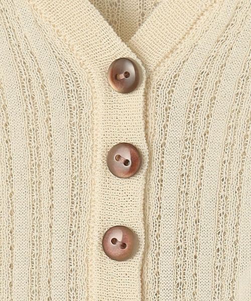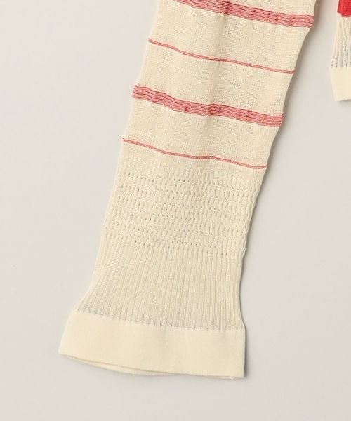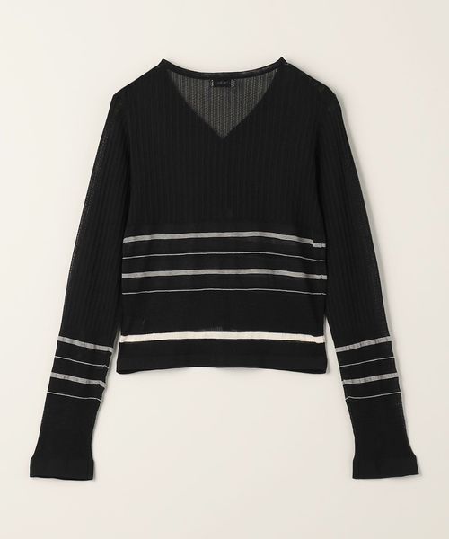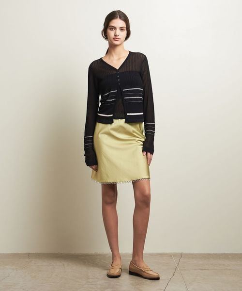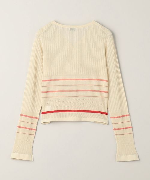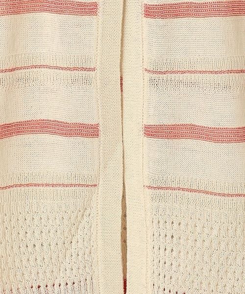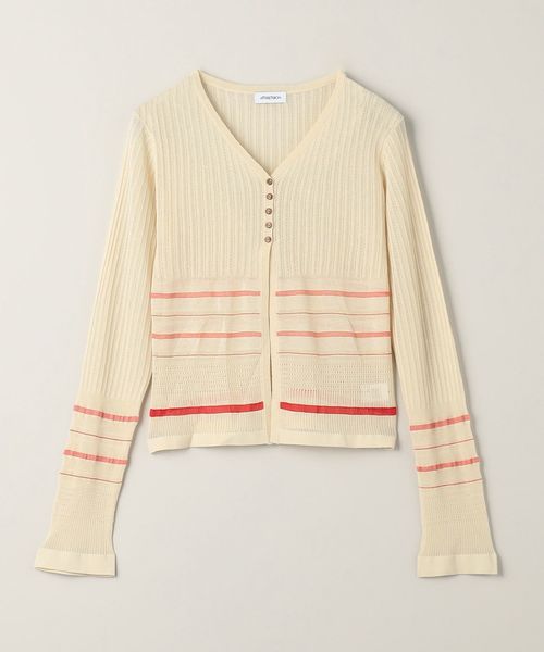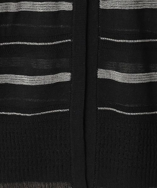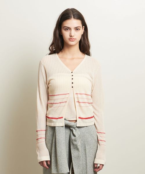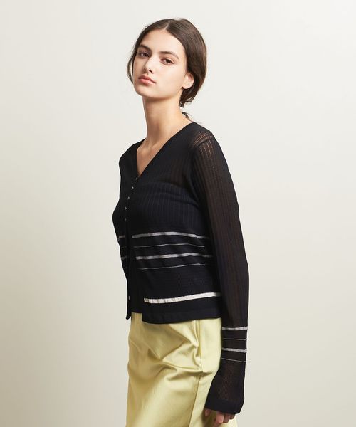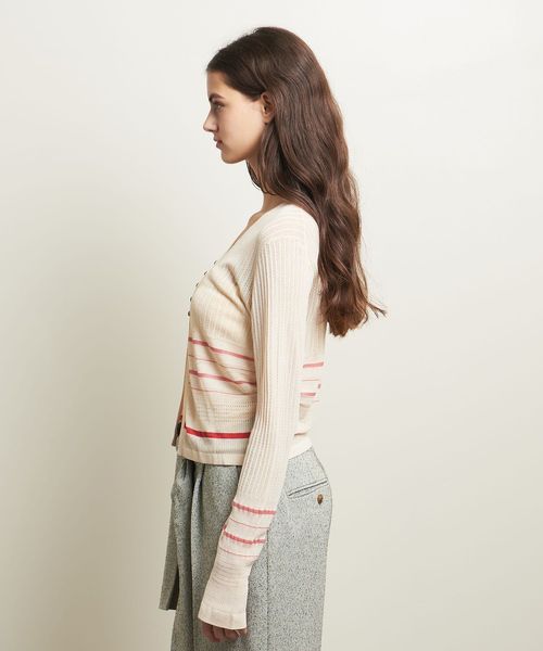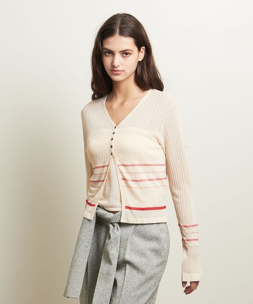 繊細なボーダー柄をアームとウエスト周りにさりげなく施した、やや透け感と表情のある編地が楽しめるカーディガン。