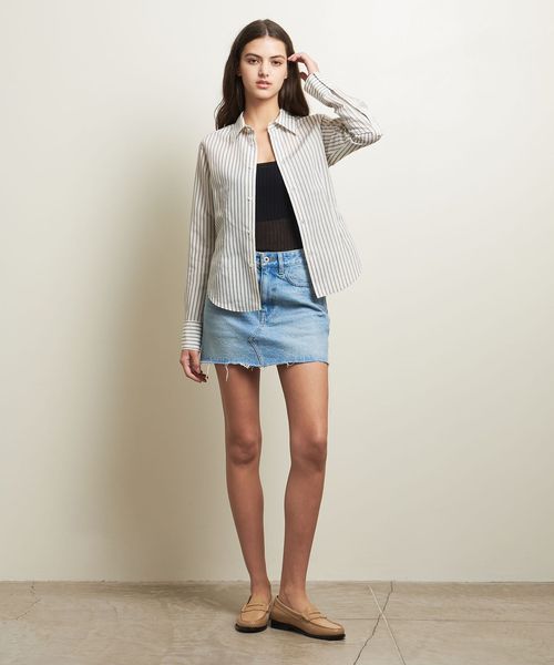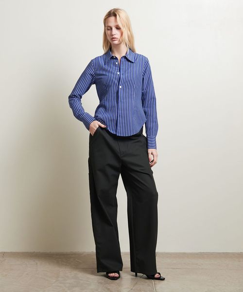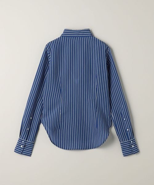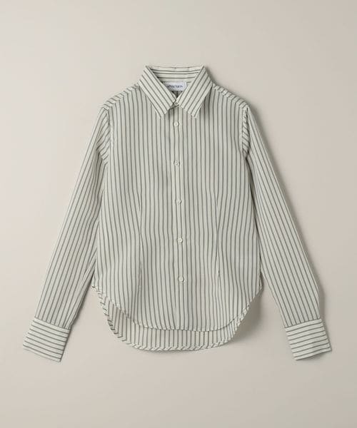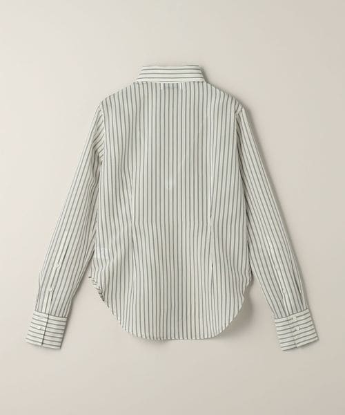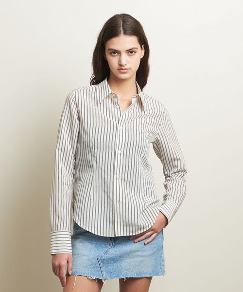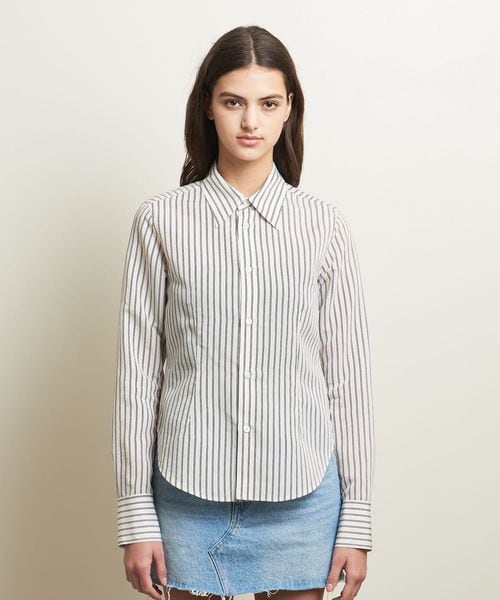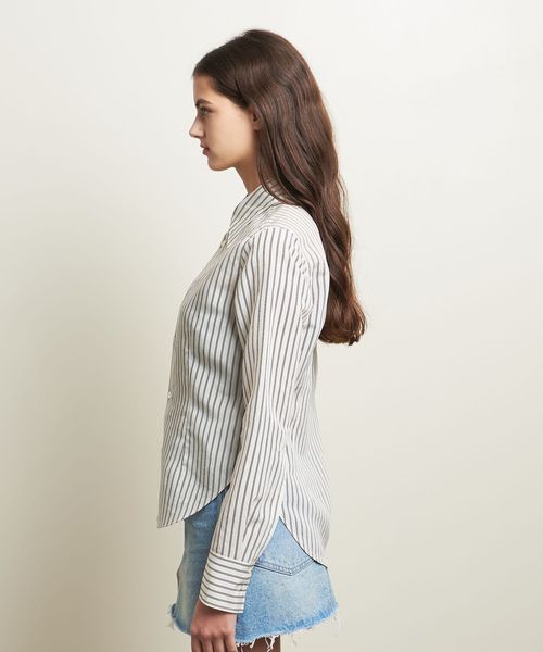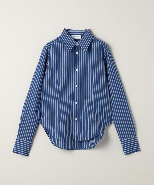 ウエスト部分のシェイプが特徴的なコンパクトサイズのストライプシャツ。