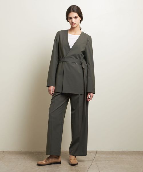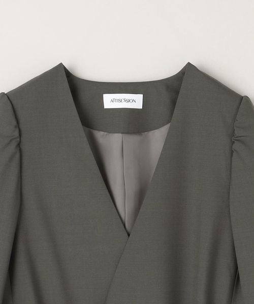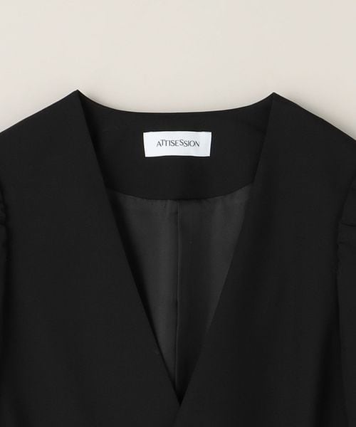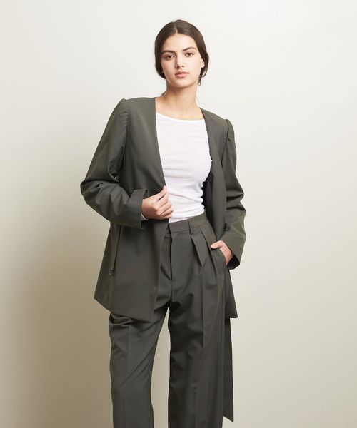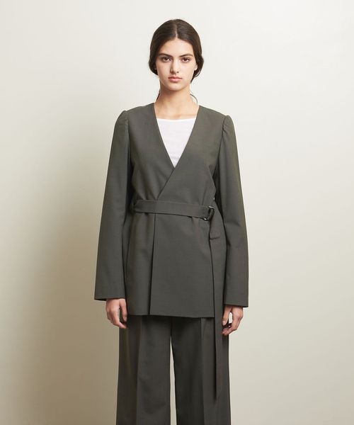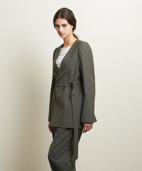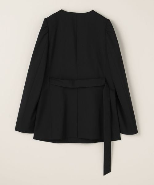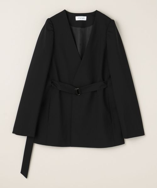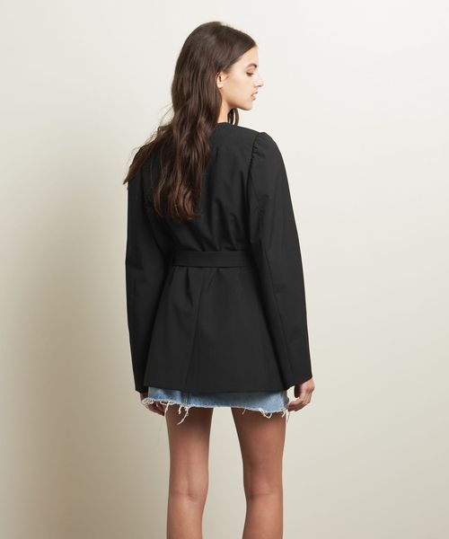 タイトな肩幅&肩先にギャザーを施したパフスリーブデザインとボクシーシルエットのバランス感がポイントのノーカラージャケット。