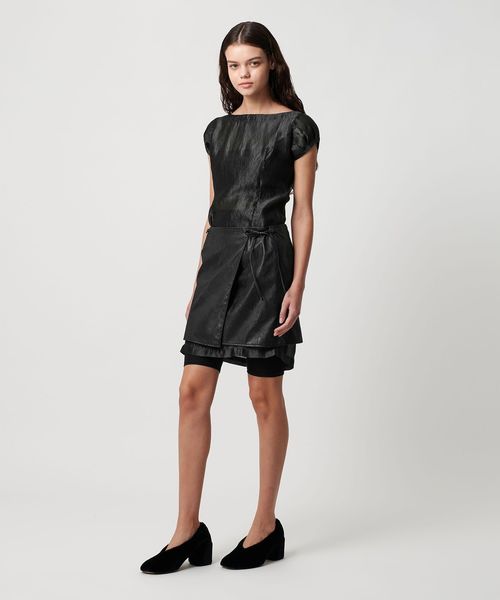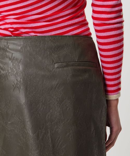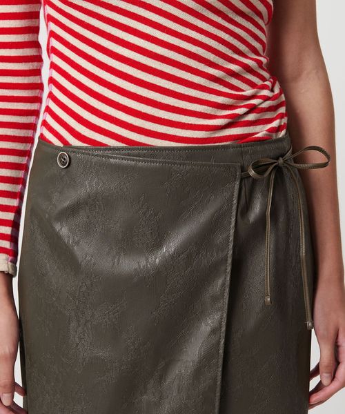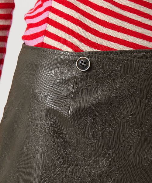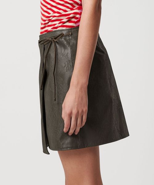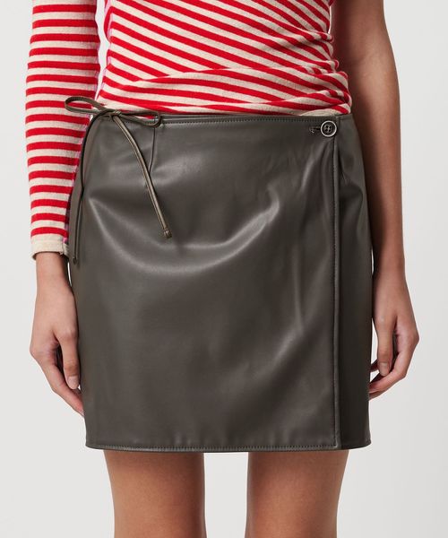 シーズンムードが高まるレザーライクな素材で魅了するラップ型ミニスカート。