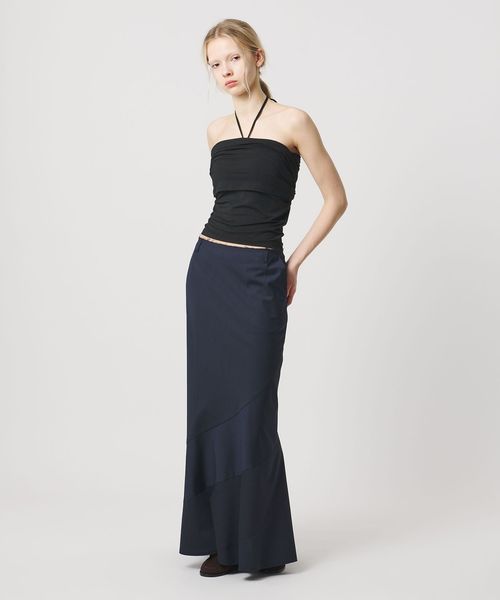 カーディガンやシアー素材のトップスと合わせたり、盛夏シーズンはホルターネック風に一枚でヘルシーに着こなすのも◎。
