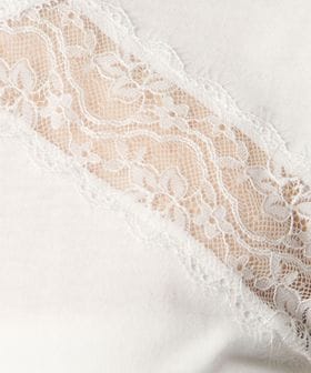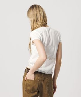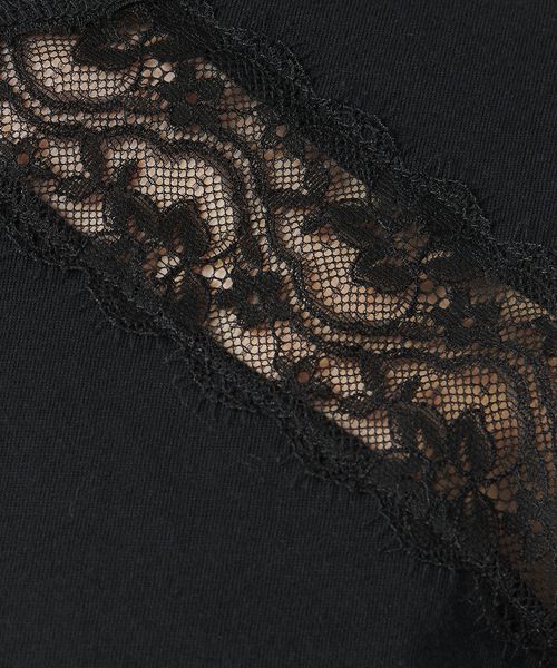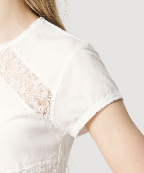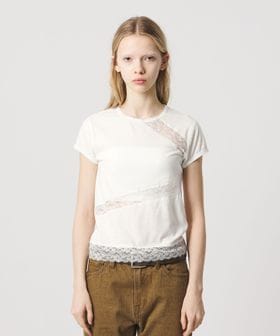 シンプルなTシャツにテープ状のレースをドッキングしたデザインが魅力的なトップス。