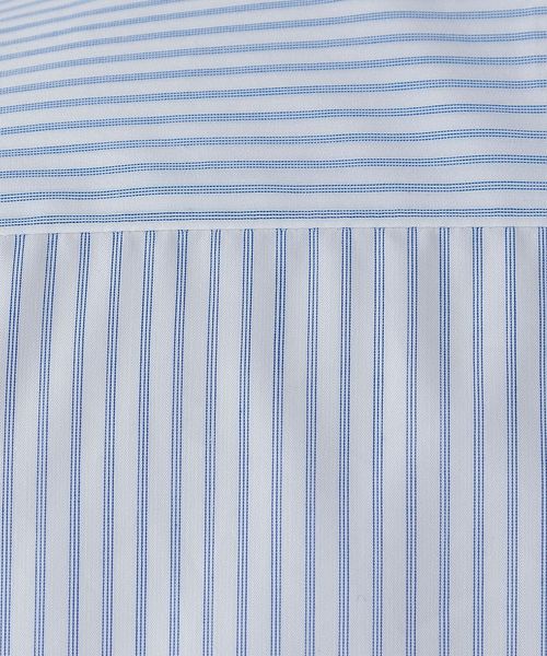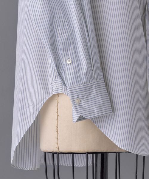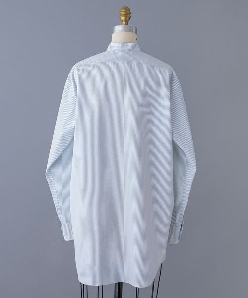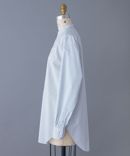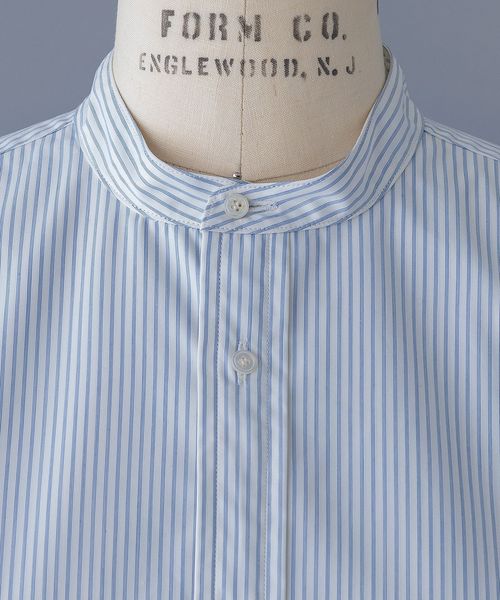 ベーシックでいて存在感のある立体フォルムが印象的なストライプ柄のバンドカラーシャツ。