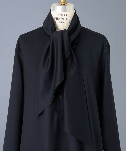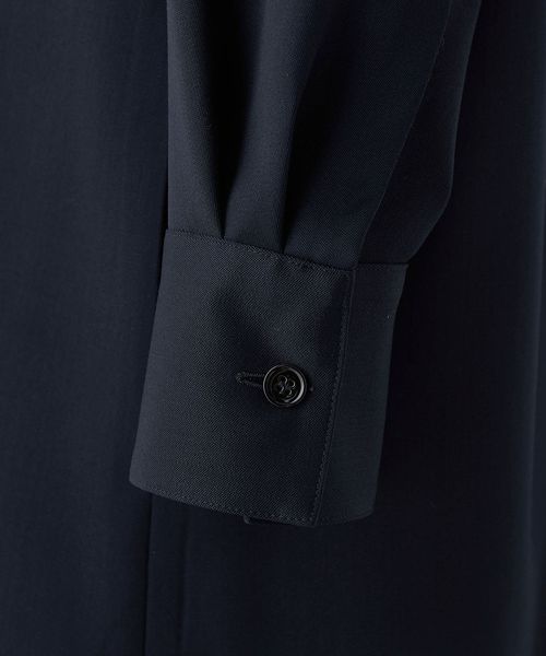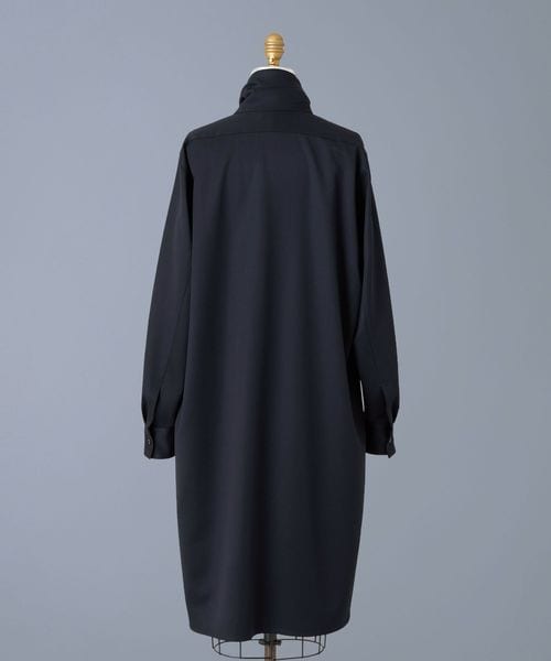 やや短めなひざ下丈のコクーンシルエットのロングスリーブワンピース。