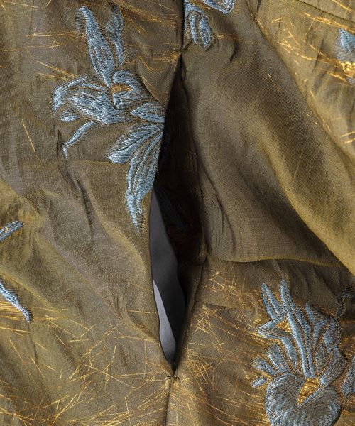 張りのある三重織のジャカード素材は、見る角度によって表情を変え、艶やかさがあります。