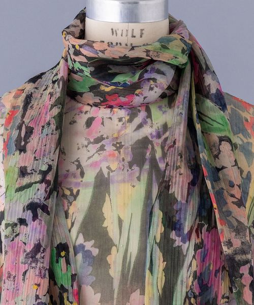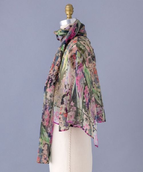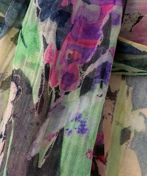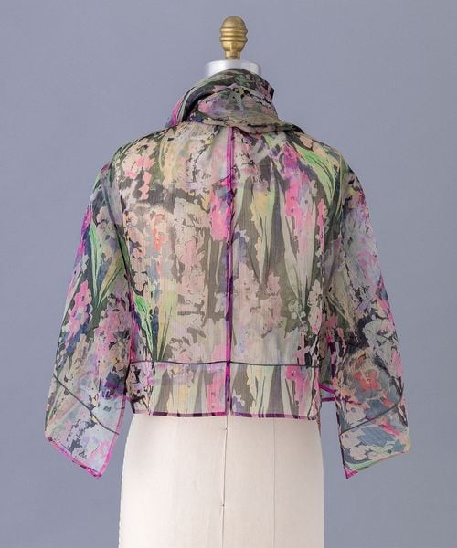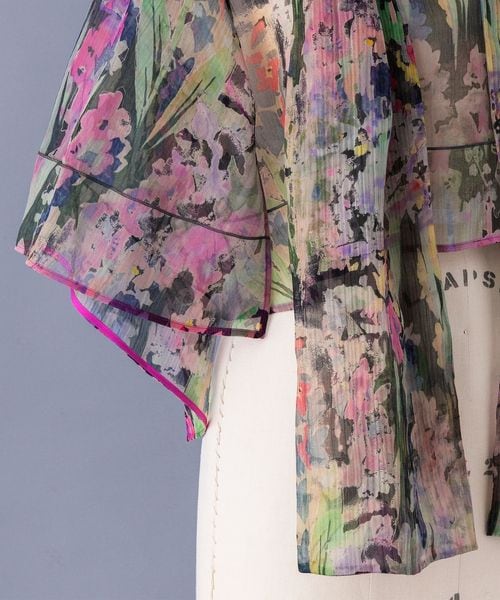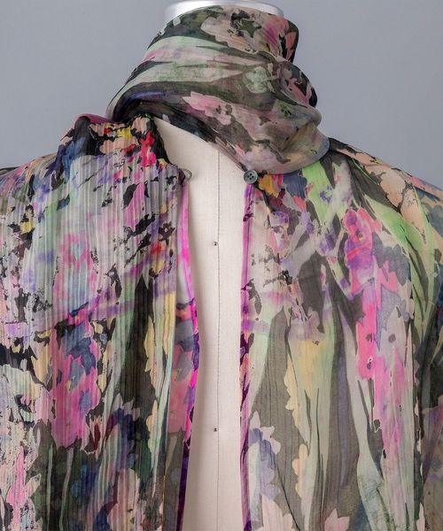 透けのあるオリジナルのフラワープリントを施したオーガンジー素材で仕立て、インナーによっても素材の表情が変化しスタイリングを楽しめます。
