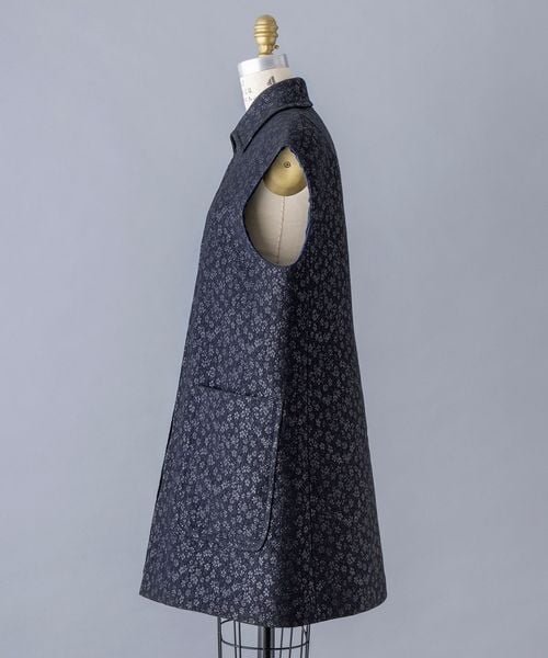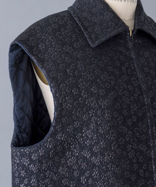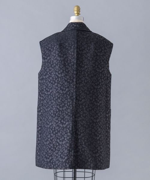 ドレッシーな佇まいでいて、中わたの入ったジャガード素材の仕様で冬の季節もスタイリングできるスリーブレスコート。