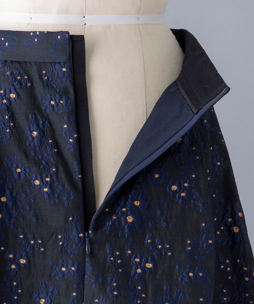 シアーな素材にのせたフラワージャガードが美しく映えるゴアードスカート