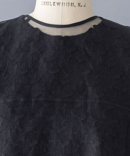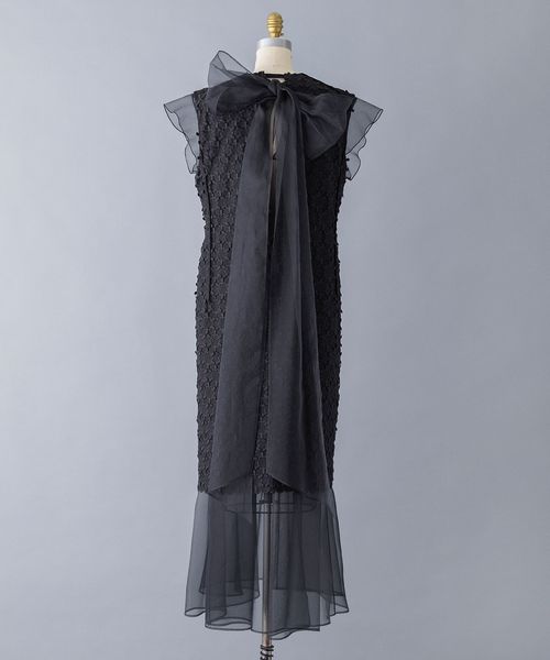 シックなブラックのフラワージャカード素材で仕立てたノースリーブのワンピースは、ベーシックなフォルムでいてバックスリットのアクセントが効いています。