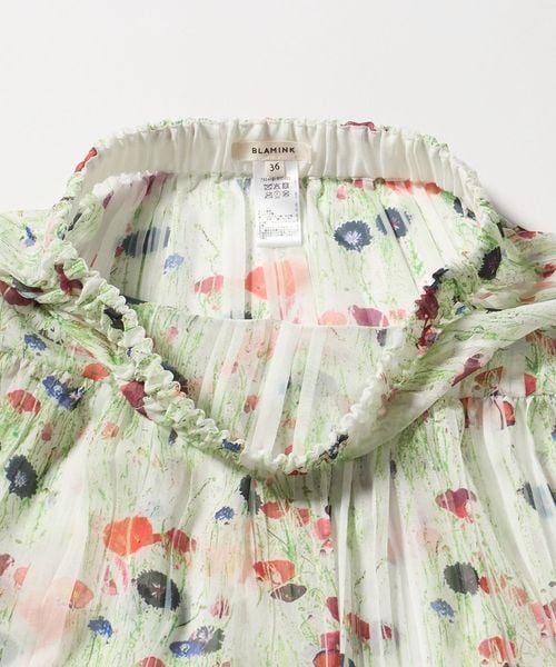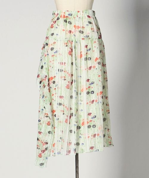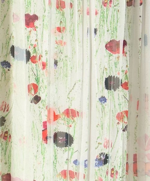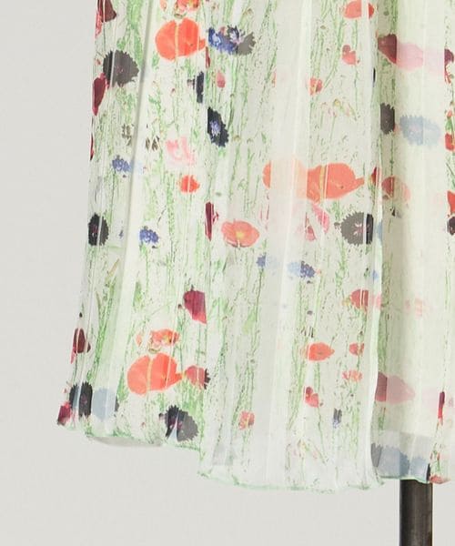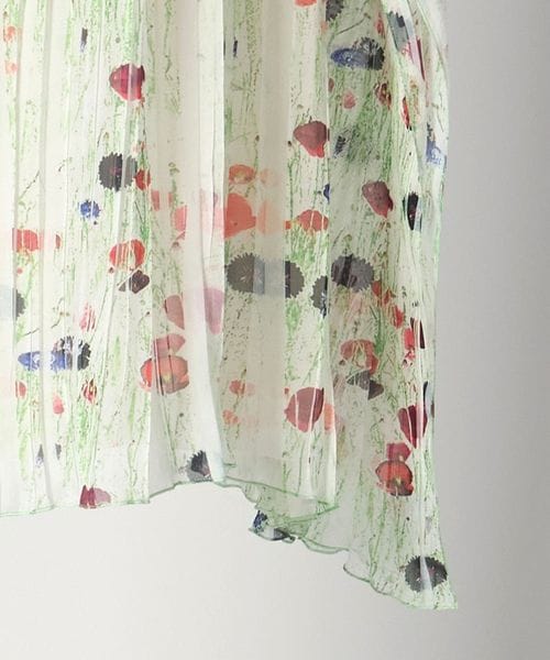 プリーツされた生地の上からポピーモチーフのボタニカルプリントを施しており、折り目の奥はプリントされていないムラのある表情感が特徴。