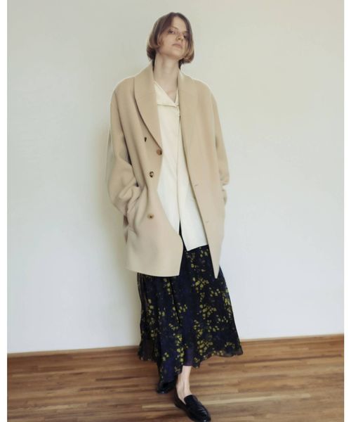 ショールカラーからつながるフロントの深い合わせのデザインが特徴のミディアム丈のコート。