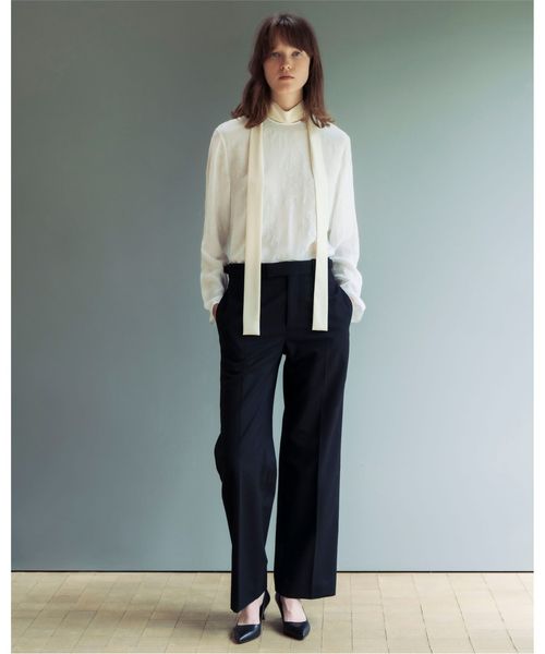 やや低めのウェスト位置のまっすぐに落ちる、マニッシュなフォルムが特徴。
