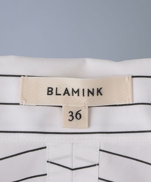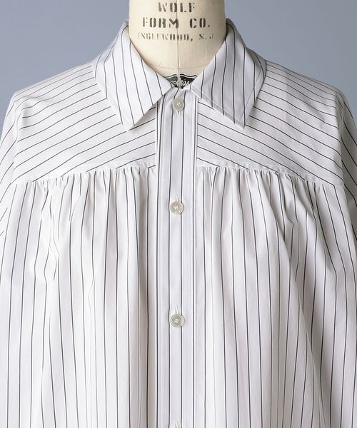ギャザーで切り替えた立体的なシルエットとストライプの柄ゆきがポイント。