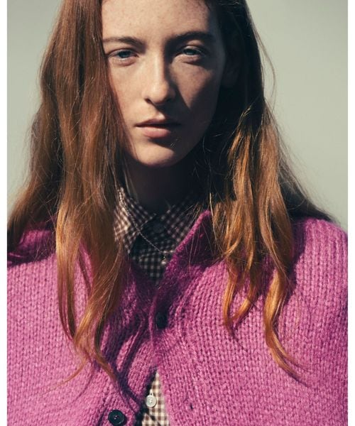 ボリュームのあるボトムスとのバランスがとりやすいコンパクトなサイズ感のカーディガン。