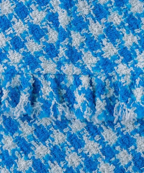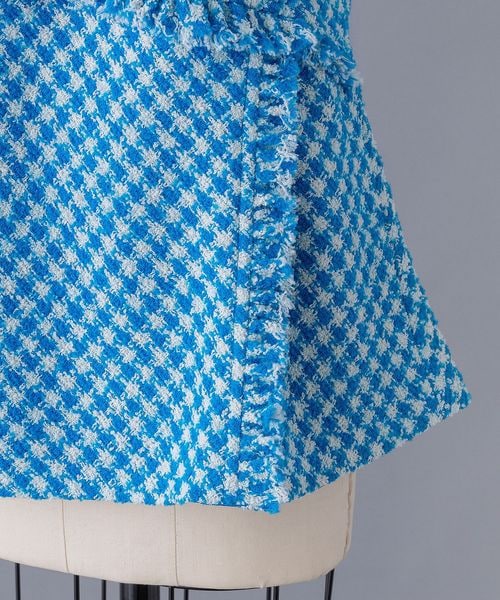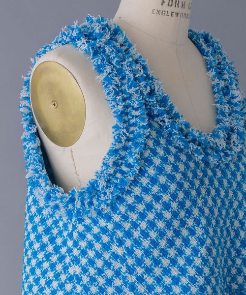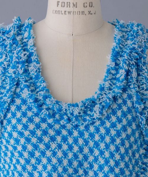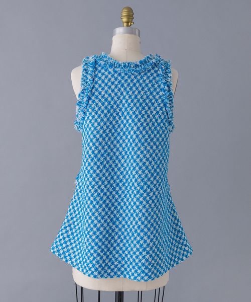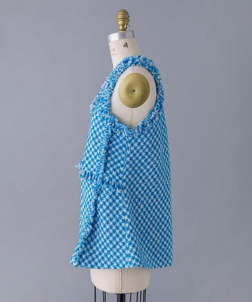 フリンジフリルがアクセントになったツイード素材のノースリーブブラウス。