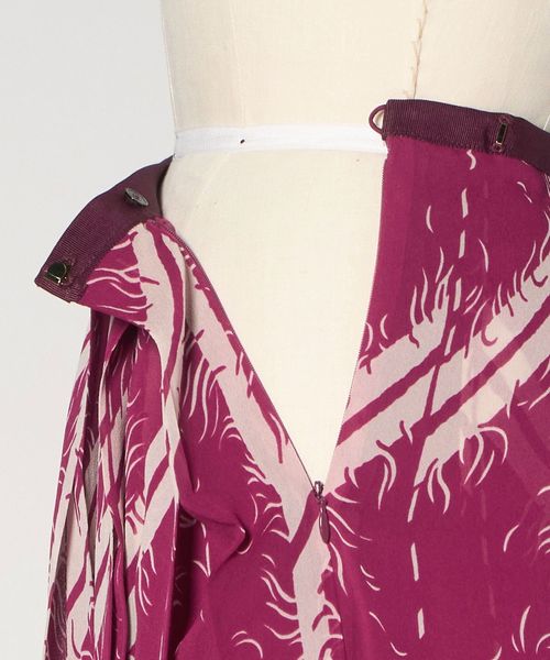 シアーなシルク素材にシックなカラーリングのプリントをのせた生地感が上品さと軽やかさを演出します。