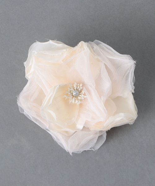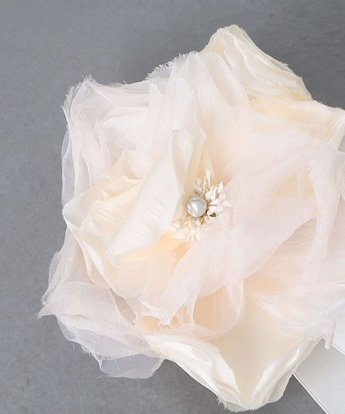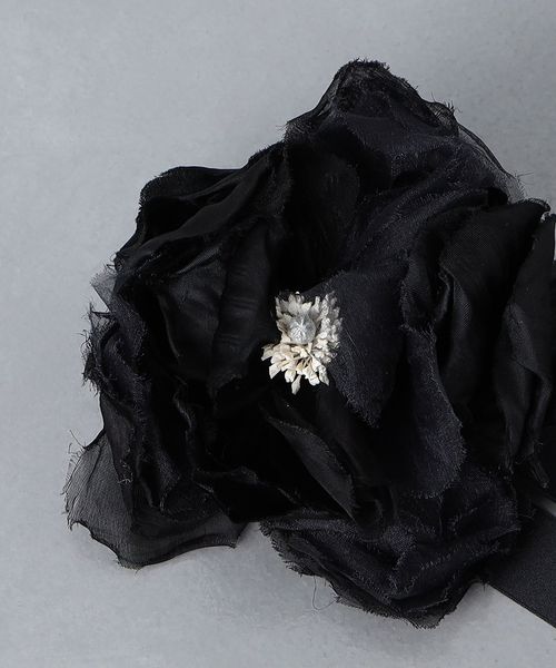 シックなカラーリングでいて、存在感のあるサイズ感が目を惹くバラモチーフのコサージュ。