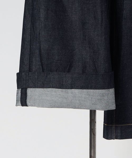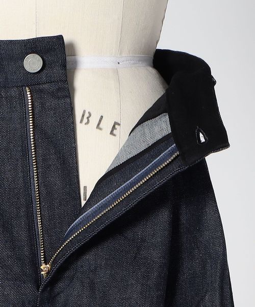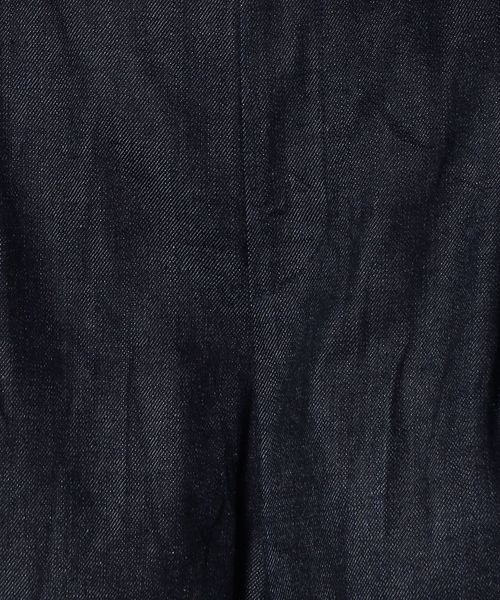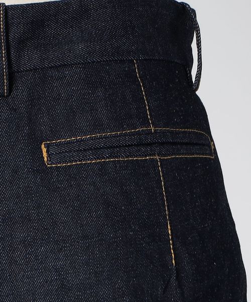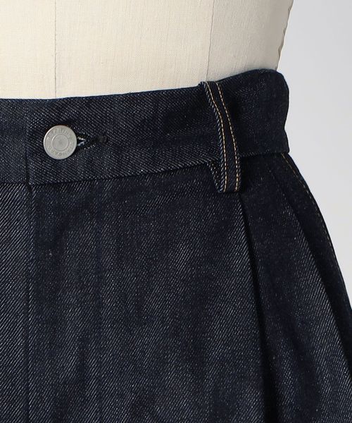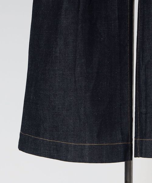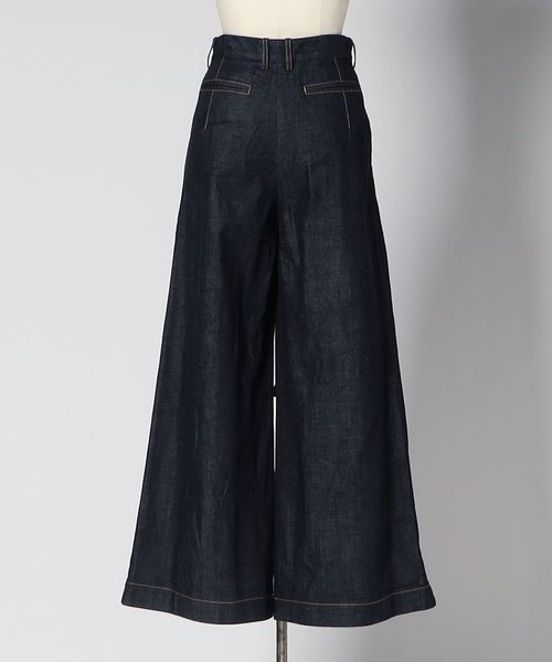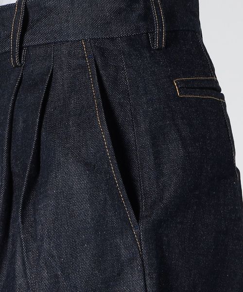 やや低めのウェスト位置とタックデザインから自然と広がるワイドシルエットが特徴のデニムパンツ。