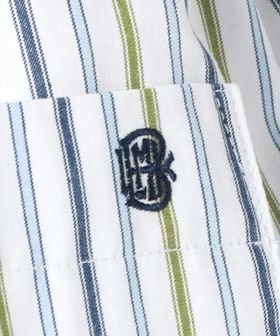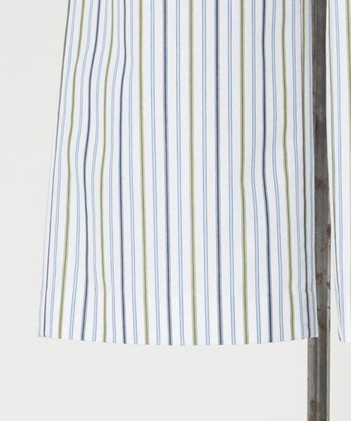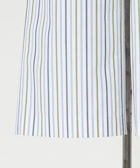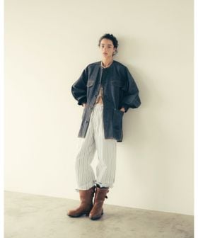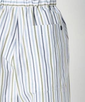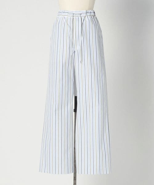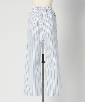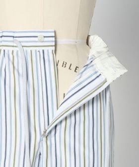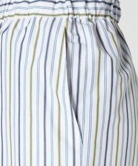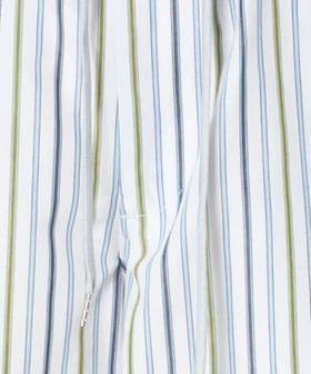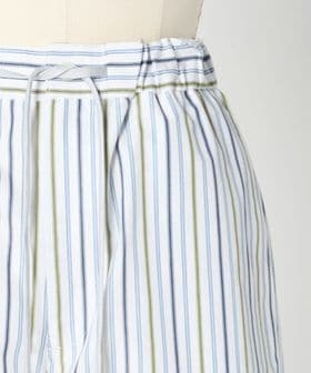 ホームウェアのようなリラクシーなシルエットでありながら、素材のハリ感とストライプの端正さが上品な印象を与えます。