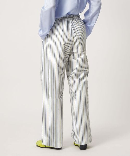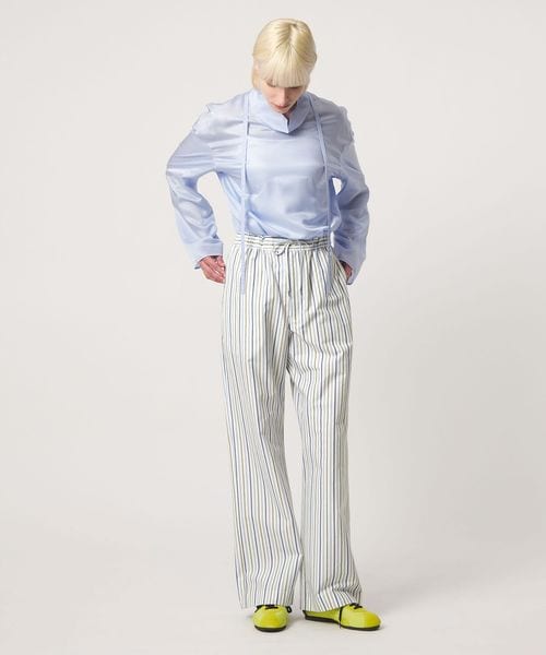 ホームウェアのようなリラクシーなシルエットでありながら、素材のハリ感とストライプの端正さが上品な印象を与えます。