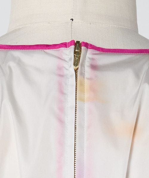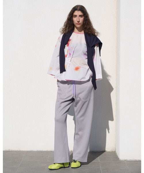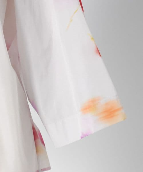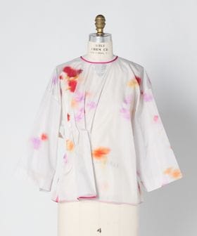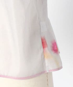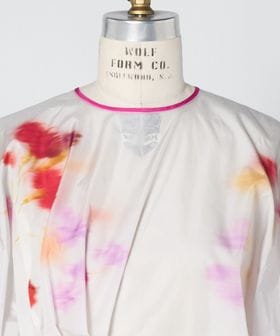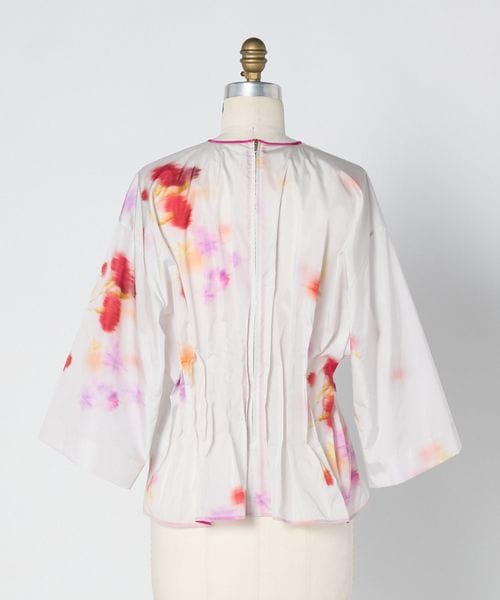 張りのあるナイロン素材に、幻想的なフラワープリントをのせたノーカラーブラウス。