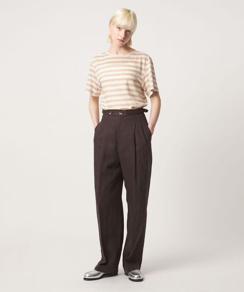 深みのあるブラウンカラーの麻素材で仕上げた、2タックのテーパードパンツ。
