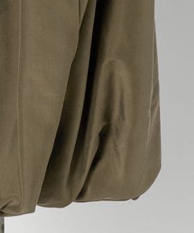 裾をひねりながら形成したバルーンシルエットが立体的なフォルムを生み、1枚で存在感を放つデザインです。