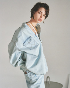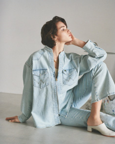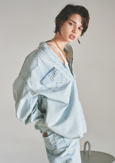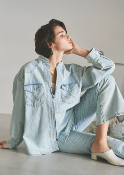 身幅を出したシルエットに、袖はタックでボリュームを付けたジップアップ型デニムシャツ。ハイウエスト型デニムパンツは、バックスリットがポイントに。