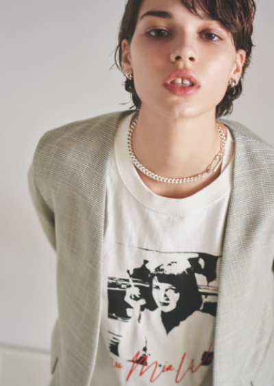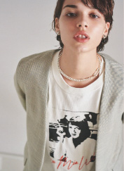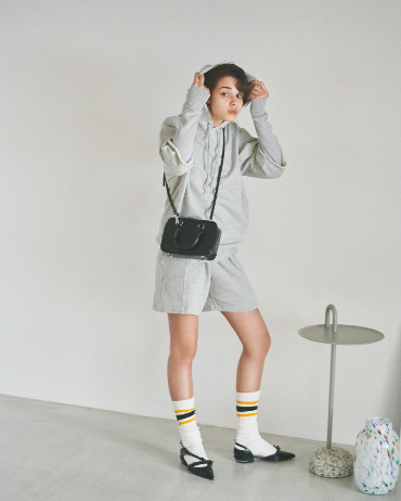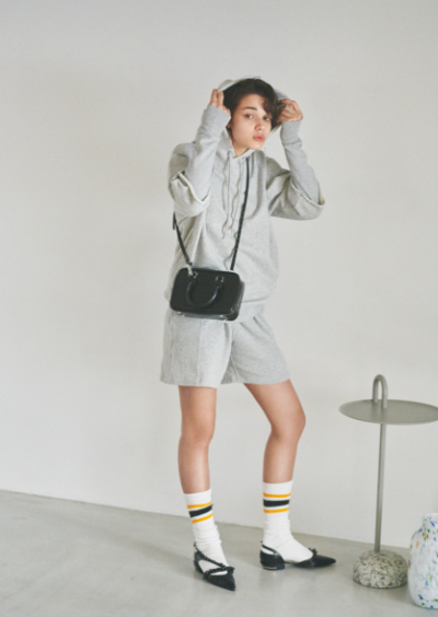 ルーズなサイズ感のフーディは、レイヤードしているような袖のデザインがユニークな一着。ショーツとコーディネートし、カジュアルなだけでなくモード感も漂わせます。