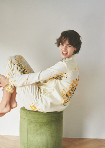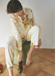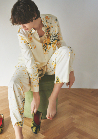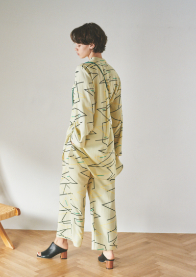 ネオンをイメージした描写が印象的なプリントのシャツとパンツ。トロミある素材の軽やかなシルエットが、女性らしさとリラックスムードを醸し出します。
