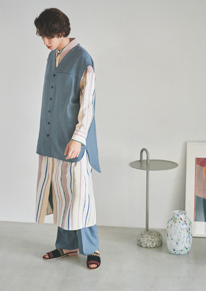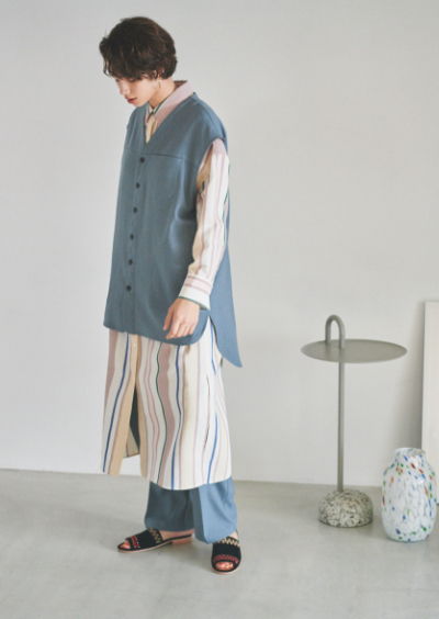 大きく前後差のある個性的ベストに、センタープリーツが美しいタックワイドパンツ。爽やかなブルーの色目がさらに引き立つよう、ロングシャツワンピースをレイヤード。