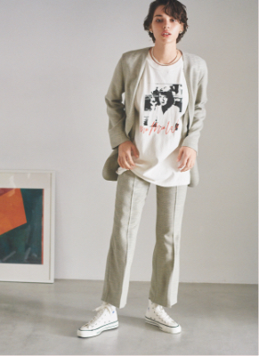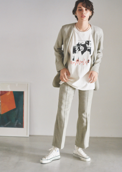 落ち感のあるハウンドトゥースで仕立てたセットアップ。センタープレスを入れ、パンツもキレイめに。合わせのインナーやシューズ次第で印象の変化を楽しめます。