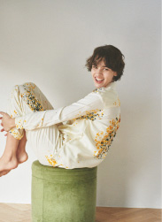スキッパーネックに、チャイナボタンをあしらったチュニックブラウスと、ドローストリングのイージーパンツ。柔らかいマルチカラーがシーズンムードを引き立てます。