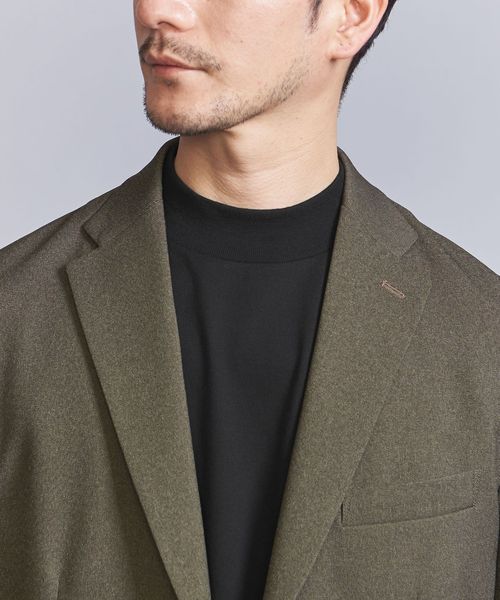 人間の腕の形状に合わせて袖山も高くし、少し前振りの袖付けなど、自然とすっきり見えるパターンに拘り、モックネックの衿の形状もジャケットに合わせても様になるように意図したバランスにしています。