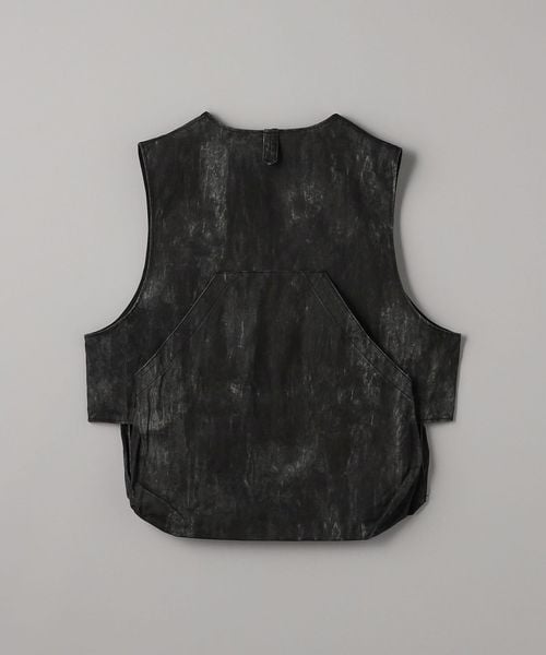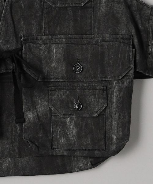 前方へぶら下がるよう取りつけられた大容量のフロントポケットや、背面のゲームポケットのディテールなど、ハンティングベストをルーツに持つ実用的なデザインが特徴的なベスト。