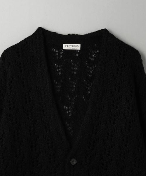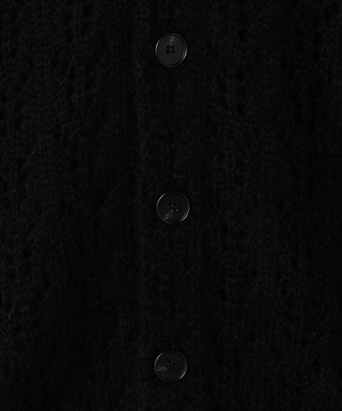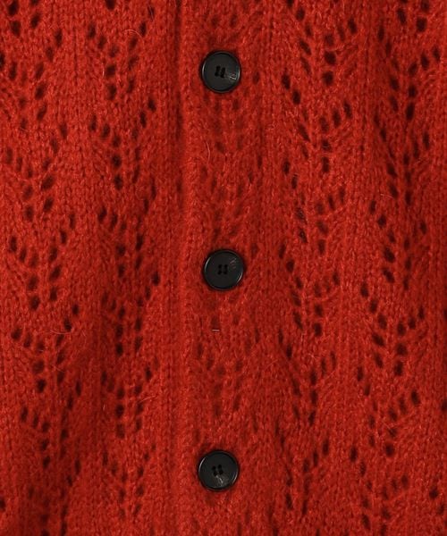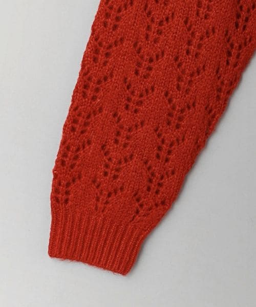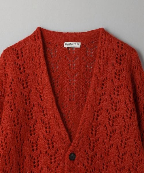 秋冬シーズンムード漂う、リーフパターンの透かし編みが目を惹くVネックカーディガン。