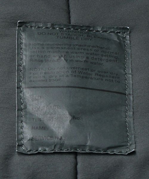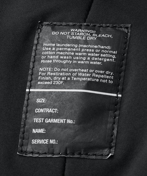 フロントの裾とバック上部にオリジナルのミルスペックを、内ポケットにサイズスペックをそれぞれ配置。
